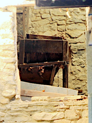 We found a cárcavo (3) between two recent constructions and we could spot a wooden tolva (3, 4 feeding hopper) through a window.