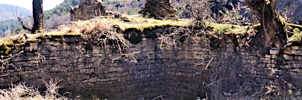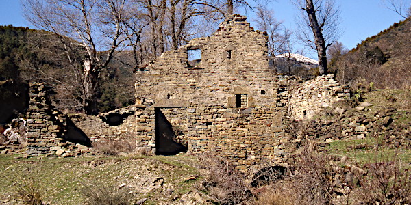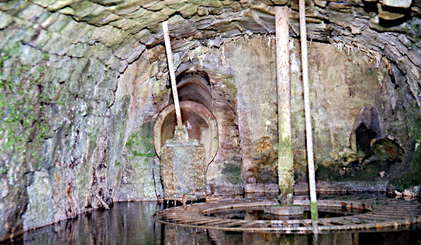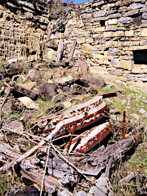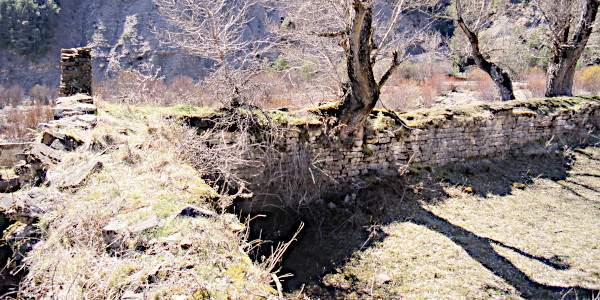 De molen is één grote puinhoop (4), maar sommige elementen kunnen nog herkend worden. De pijlen (4) wijzen naar de stenen (6), de drukpijp, en de Francis turbine (7). Naast het betonnen vat in het midden liggen de ingewanden van een graankuiser (5).