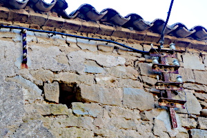 De ouderwetse isolatoren (9) op een bijgebouw doen denken aan een elektriciteitscentrale.
