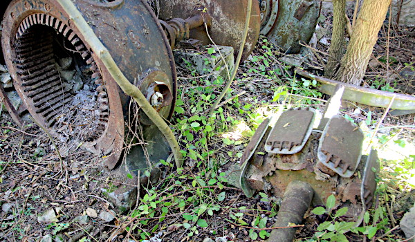 Inside, the heavy equipment (5–7) is still present, but has been largely dismantled to take the copper wiring away (7).