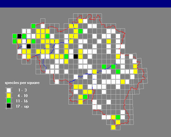 Opiliones in Belgium: number of species per square
